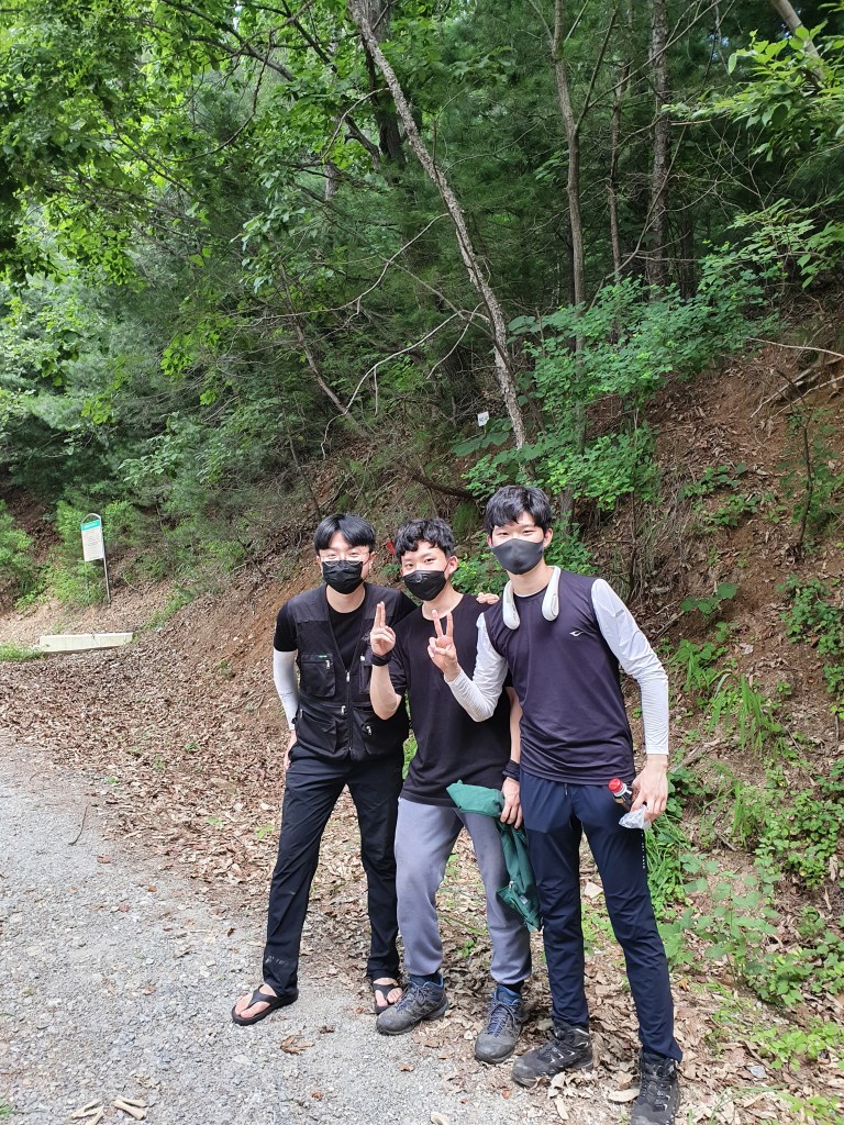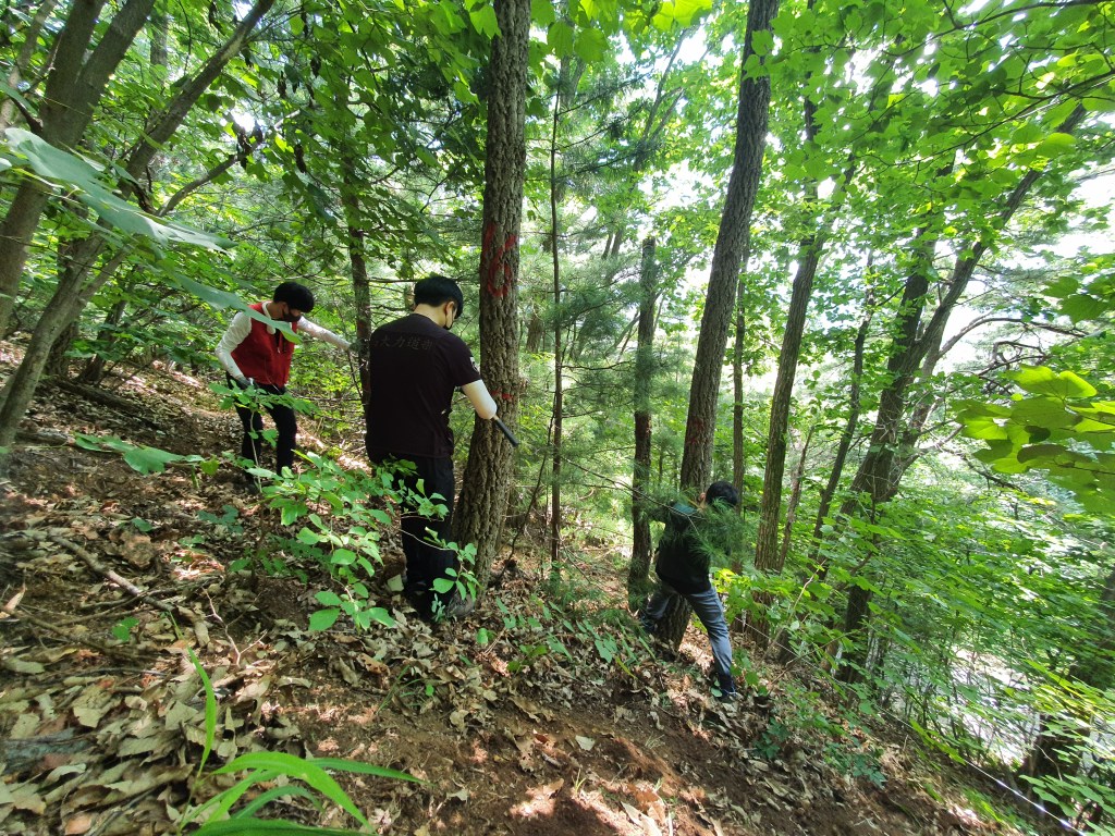 2021.07.27. 봉명학술림. 참나무류 천연림보육작업(간벌) 시험지 매목조사 및 토양시료 채취. Kim HS (좌), Ahn JG (중), Song KH (우).